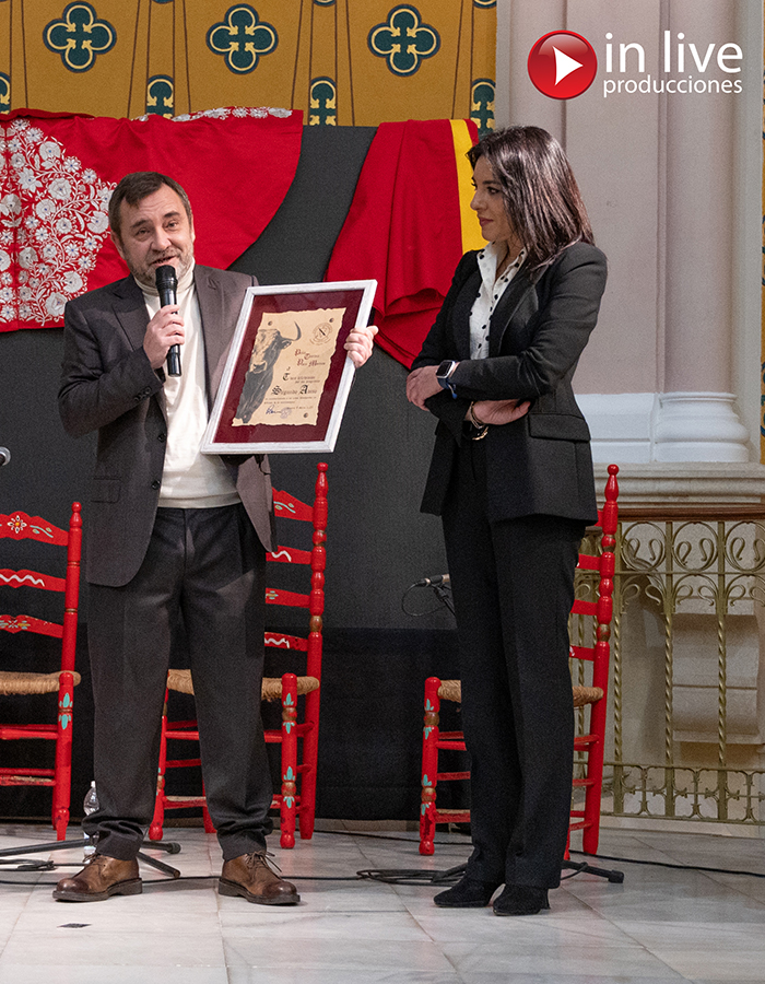 El torero Manuel Rodríguez "El Pelos" recibió un reconocimiento por su trayectoria. Se da la circunstancia que el veterano matador es socio de la propia peña. El obsequio fue entregado por una de las y que entregó una de las propietarias de la plaza de toros, Rosel Giménez.